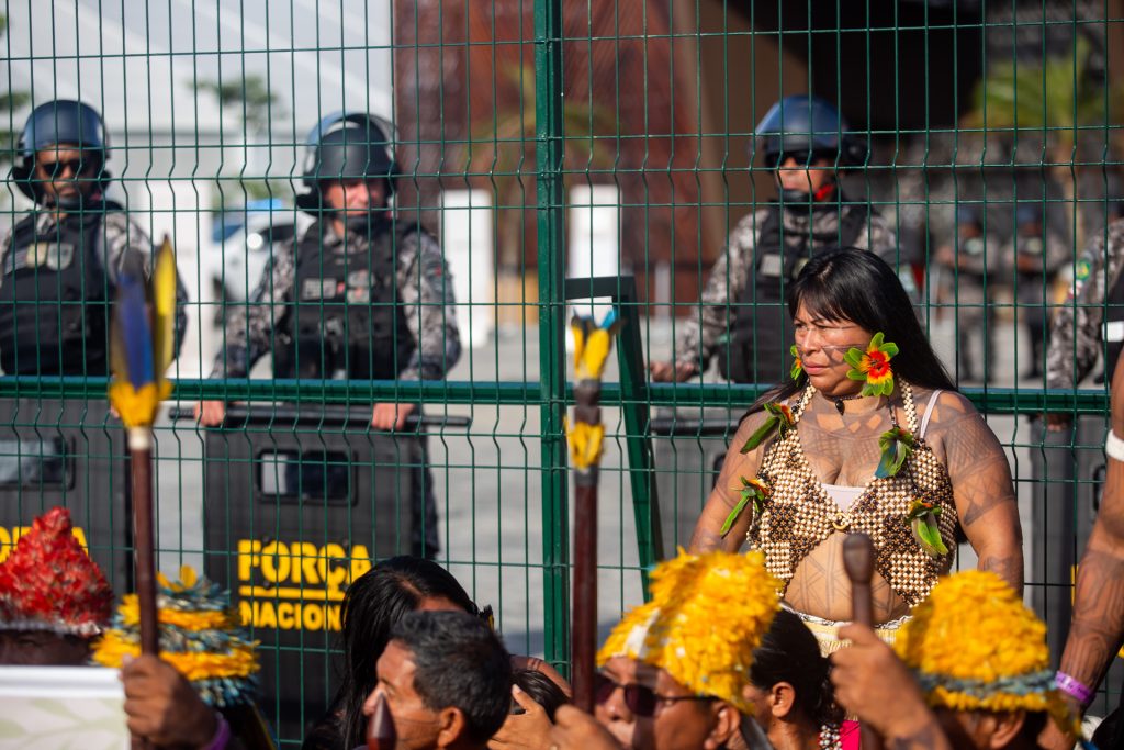 Después de cruzar con determinación la barrera de seguridad de la COP, que aún se estaba despertando, Alessandra, de aproximadamente 1,50 metros de altura, se hizo gigante y organizó dos columnas de defensa de hombres. En el cantero central, pronunció el primer discurso sobre la protesta, un grito que tenía atravesado en la garganta desde el comienzo de la conferencia contra las empresas y los países que utilizan a los pueblos indígenas para ecoblanquear su imagen. «Ya basta de usar nuestra imagen para decir que es sostenible», dijo la lideresa Mundurukú.