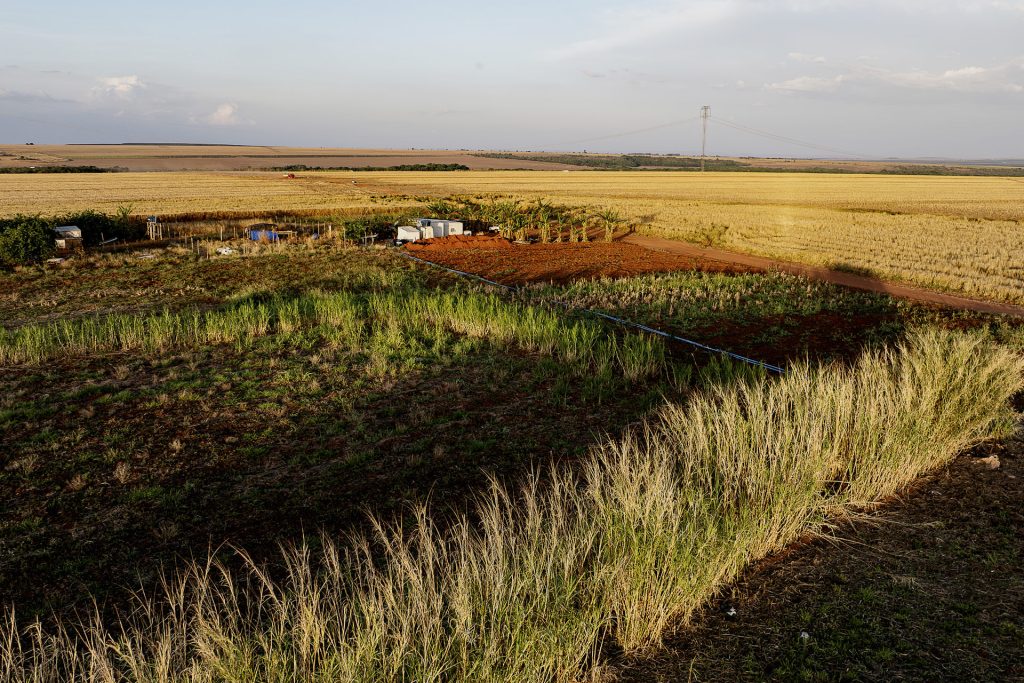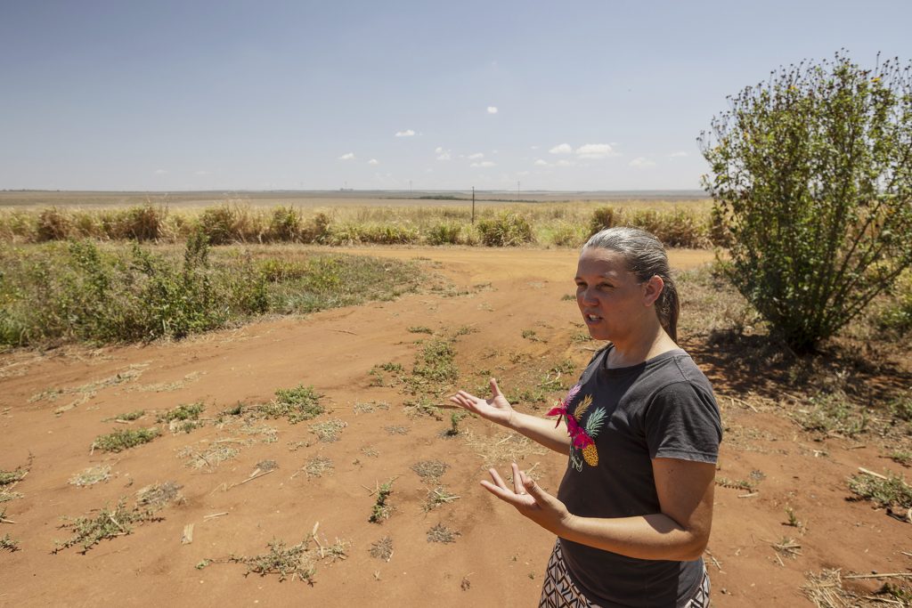 Fardos de algodão em uma fazenda vizinha à Terra Indígena Tirecatinga, no município de Sapezal, em Mato Grosso. Foto: José Medeiros/SUMAÚMAA paisagem muda bruscamente quando o viajante se aproxima da TI Tirecatinga, onde a vegetação típica da transição entre Cerrado e Amazônia, com árvores retorcidas, ainda resiste intocada e protegida pelos Indígenas Nambikwara, Manoki, Paresi e Terena. A exceção é um terreno estimado pelos habitantes da TI em 10 mil hectares, que parte dos Indígenas também passou a usar para a monocultura, principalmente da soja.