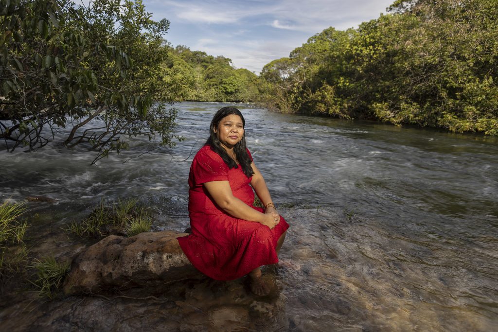 A Indígena Terezinha Amazucaerô mergulha no Rio Papagaio, em Sapezal, usado pela comunidade com preocupação. Foto: José Medeiros/SUMAÚMA
