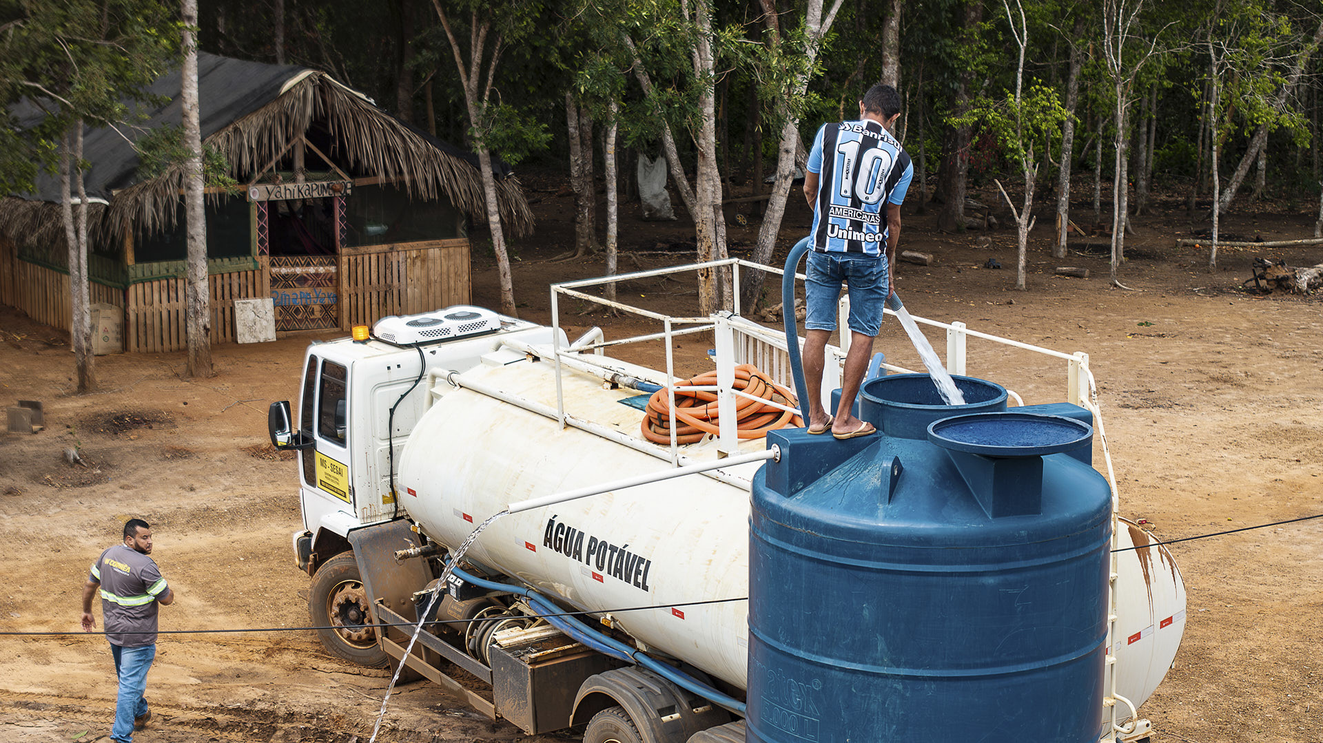 A aldeia Serra Azul fica a poucos metros do Rio Buriti, no coração da Terra Indígena Tirecatinga, em Sapezal, a cerca de 510 quilômetros de Cuiabá, em Mato Grosso. É um rio calmo e fundo, com margens protegidas por uma densa vegetação e árvores imponentes como as palmeiras que lhe dão o nome. Em alguns pontos, a água cristalina permite ver cardumes de peixes e pedras ao fundo. Há sete meses, porém, os Indígenas se recusam a utilizar essa água para qualquer tarefa cotidiana na aldeia. Não a bebem, não lavam roupas, não se banham. Desde setembro passado a aldeia é atendida por um caminhão-pipa com 5 mil litros para abastecer a caixa-d’água que serve à comunidade. O rio que banha sua aldeia se tornou perigoso.