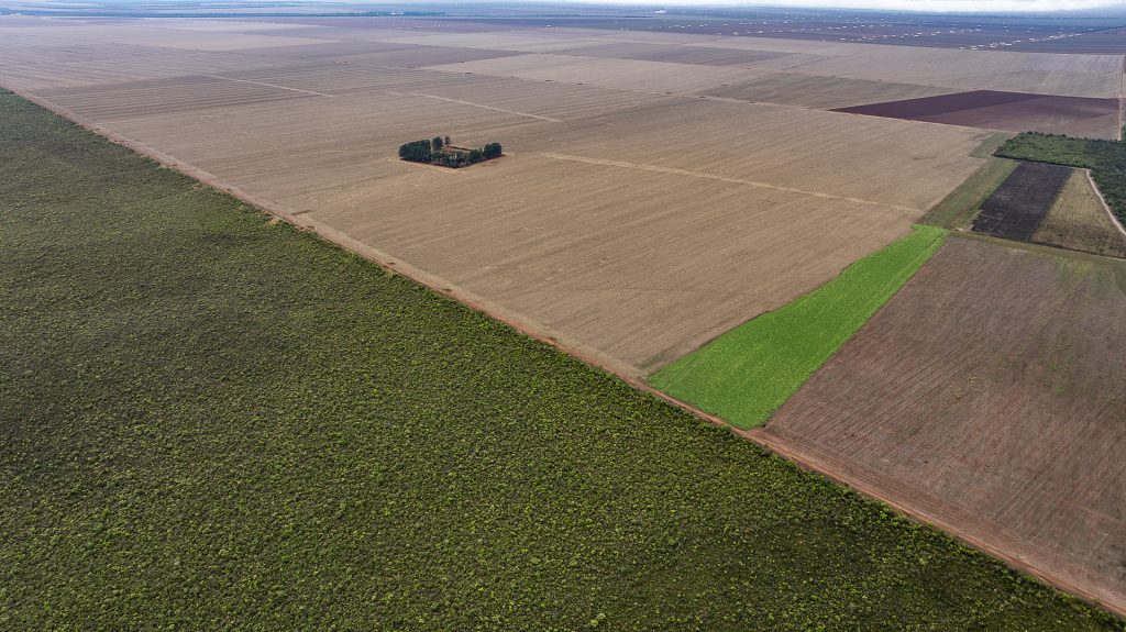 Vista aérea da Terra Indígena Tirecatinga, no município de Sapezal, em Mato Grosso. Ao fundo, fazendas expandem suas plantações. Foto: José Medeiros/SUMAÚMA